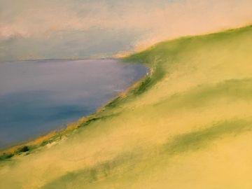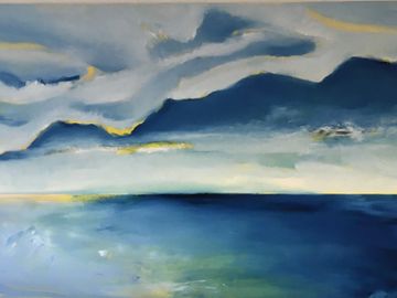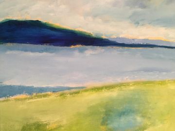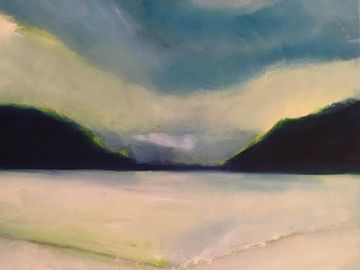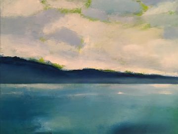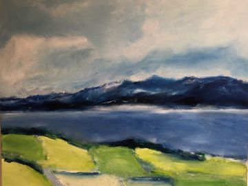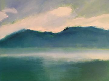 Les coups de pinceau recréent – parfois dans une même toile –, la douceur des collines, la violente raideur des montagnes, la lumière envahissante, la fin d’une tempête, les traces du vent ou les rayons du soleil filtrés par les nuages ainsi que par le reflet du grand miroir d’eau. Ces peintures à l’huile sont donc des images et des moments en mouvement, qui reviennent au présent (absolu ou universel), en couches nuancés de gris, de bleus, de jaunes et de verts. Des vues panoramiques intimes exposées en plan de couleurs.